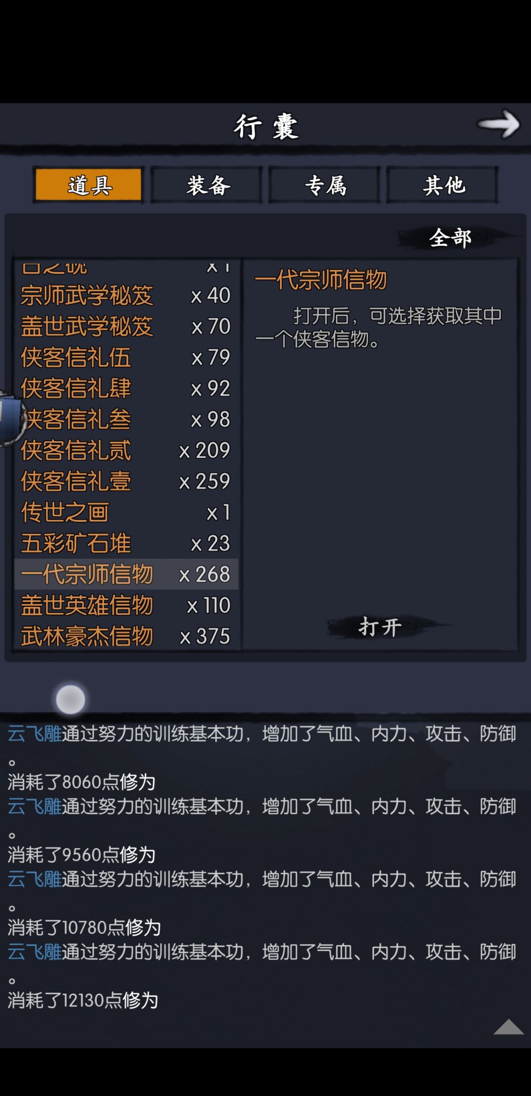 接下来所有侠客1-1 1-2都开开来(有信物就开,五行侠客信物在背包里懒得开了,修习录包够的,30.9天天挂历练就是不缺资源P6,(其实我棍法修习录都有1.2w个了))