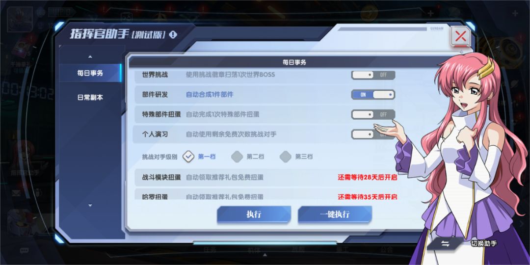 指挥官可通过该功能,一键完成每日副本、挑战玩法、奖励领取等日常事务,还能一键清理日常副本,真正实现 “一键收菜”,帮你解放时间、轻松护肝!