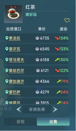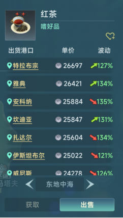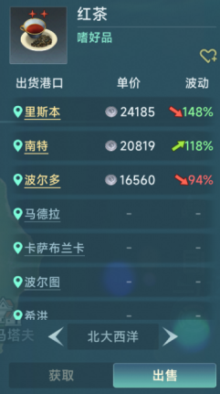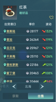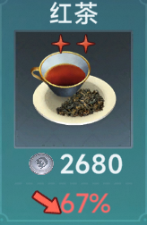 红茶基础价格4000(100%),属于2星嗜好品,最低价格可达2400元(60%)左右,而出货价却是相当不错,北大西洋2.4w,北海2.8w,西地2.4w,东地2.7w,加勒比2w,中南美2.4w。而且行情长期存在,各地都有可能出现出货行情,没有囤货之忧。