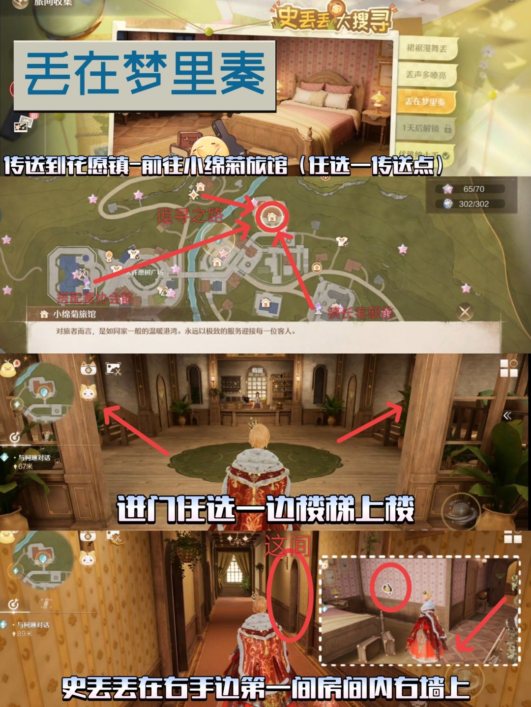 ②位置:进入小绵菊旅馆后任选一边楼梯上楼,史丢丢在右手边第一间房间内,面朝床右边墙上就是。