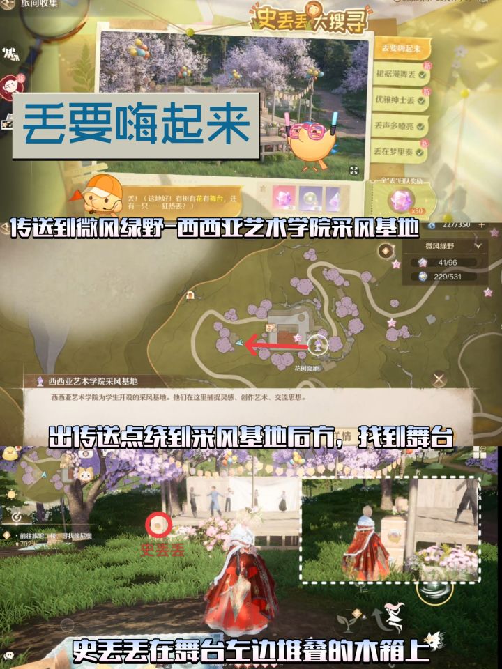 出传送点绕到采风基地后方找到舞台,史丢丢在舞台左边堆叠的木箱上。