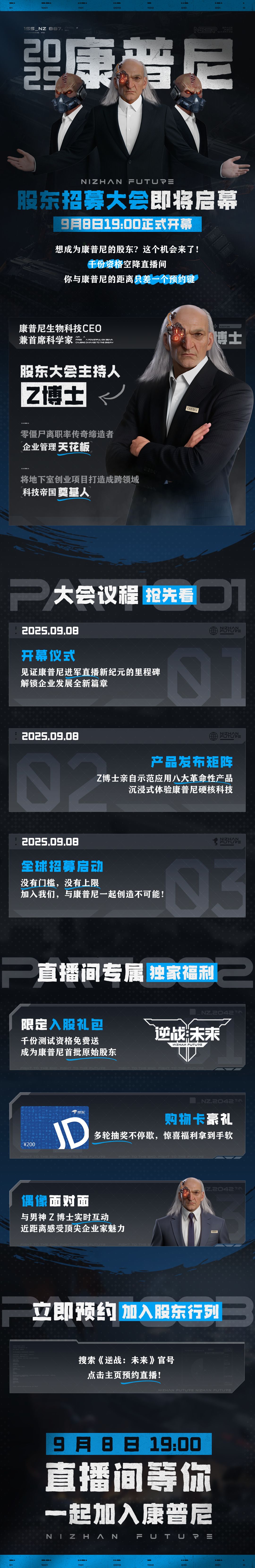 为庆祝《逆战:未来》进化测试9月8日正式启动,Z博士在此正式邀请大家参与【2025首届康普尼股东招募大会】。