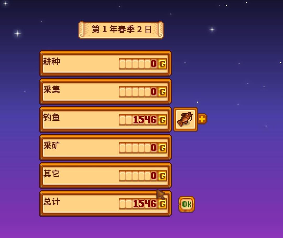 这里给萌新科普一下:完美垂钓(保持鱼在绿条内)经验是普通的2.4倍,获得宝箱经验是普通的2.2倍。第二天的目标是攒钱(约1800金)购买玻璃纤维钓竿(可装鱼饵),捡了野葱这些恢复体力钓1300+金币也上并不难。