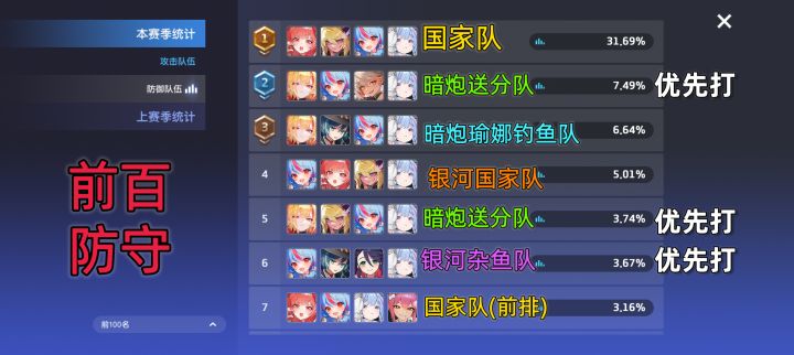 图2、3为当前版本防守阵容排行,供参考。未来一段时间棒球妹的普及率可能会略微提高,但除了前20依旧是暗刀的天下。