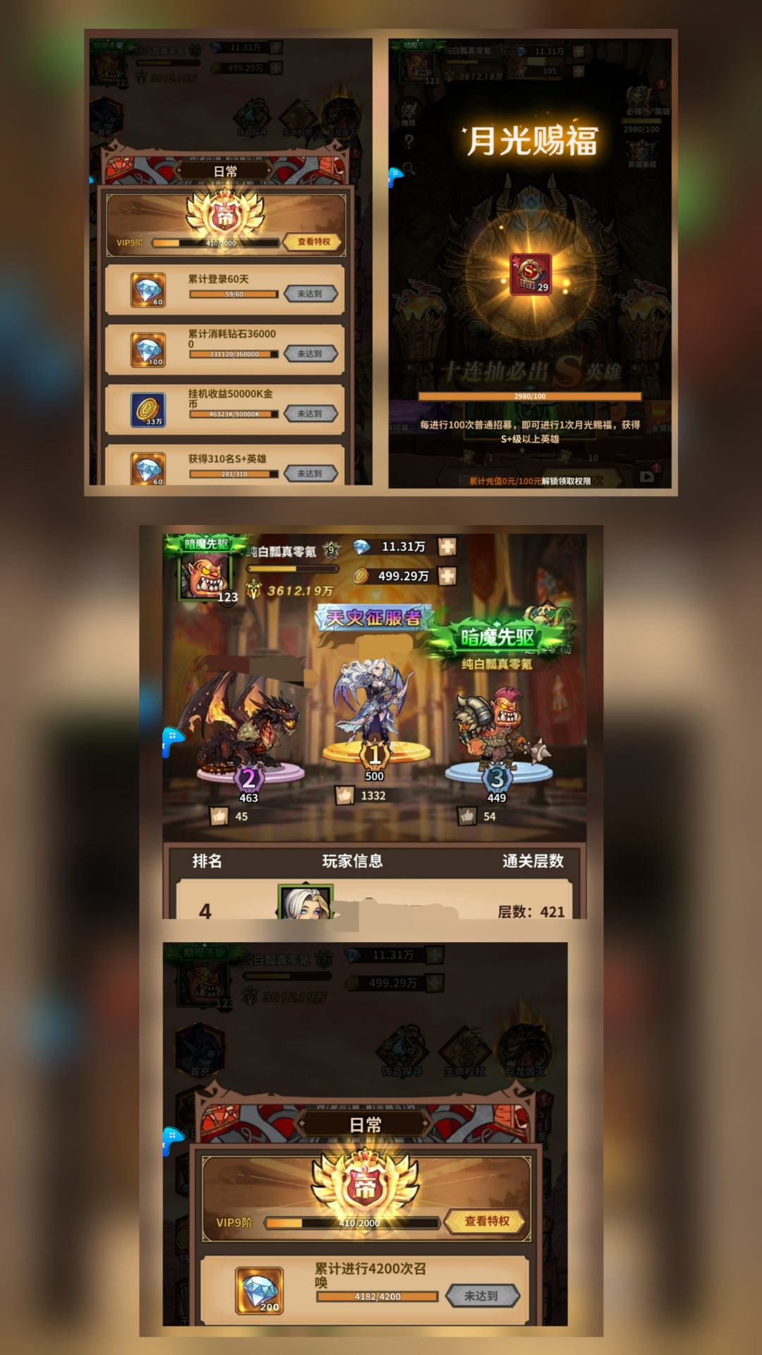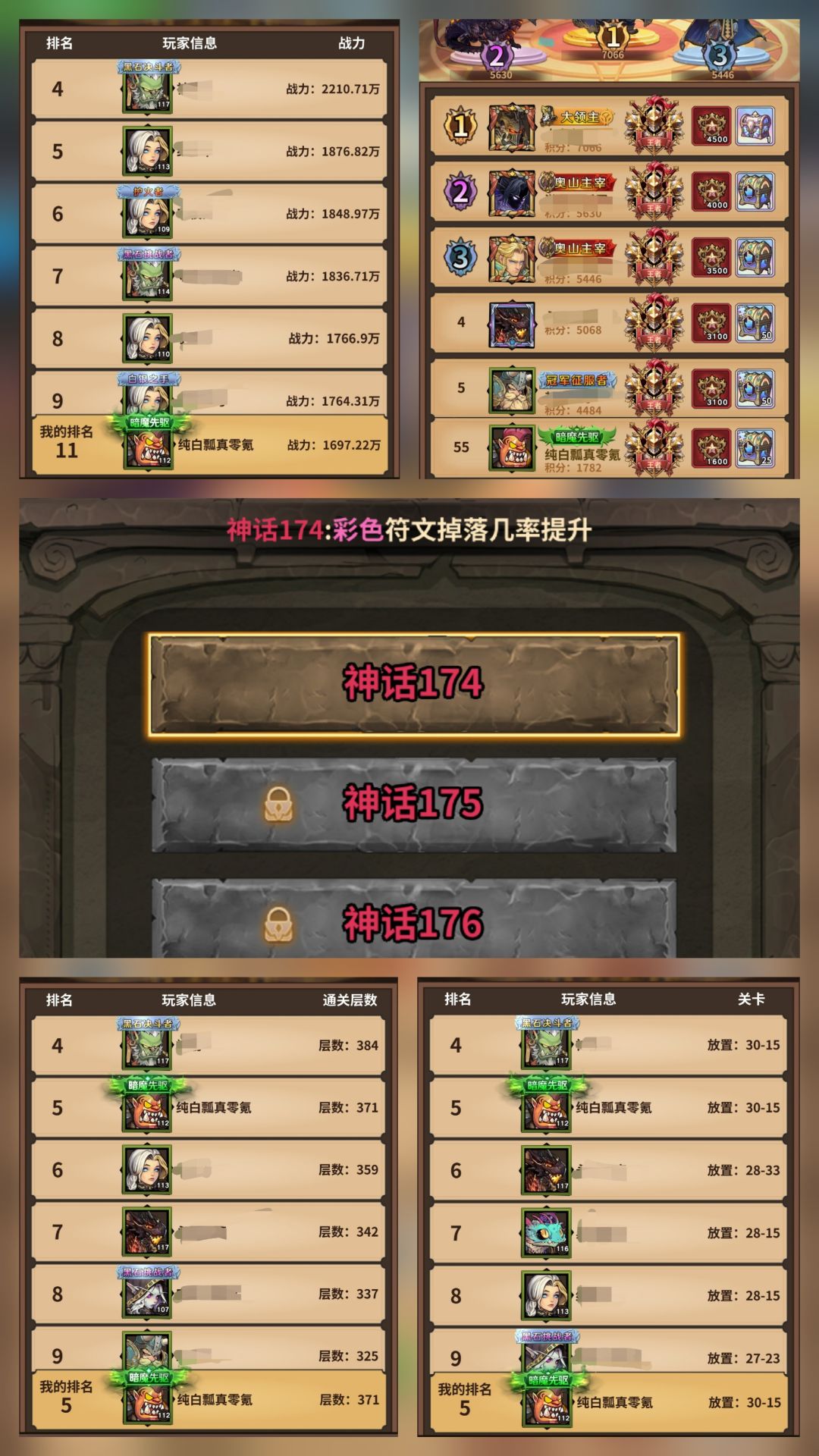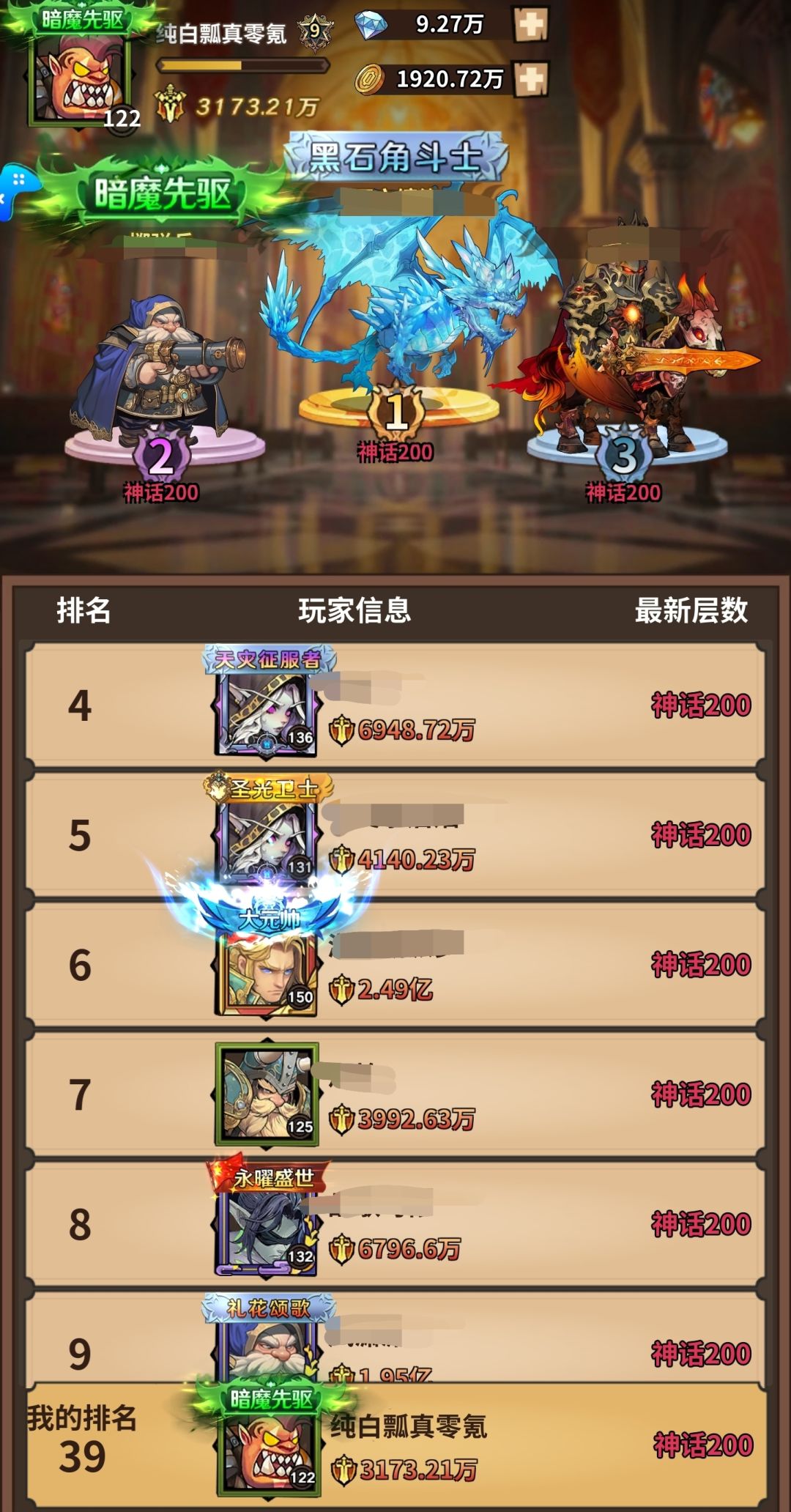 10.9.1 白嫖,打的肯定没氪金的顺利,毕竟马上第三队也要出传奇怪了,但是副本爬塔均是排第三,竞技场前十(没办法,什么都舍不得分解,虚的很)