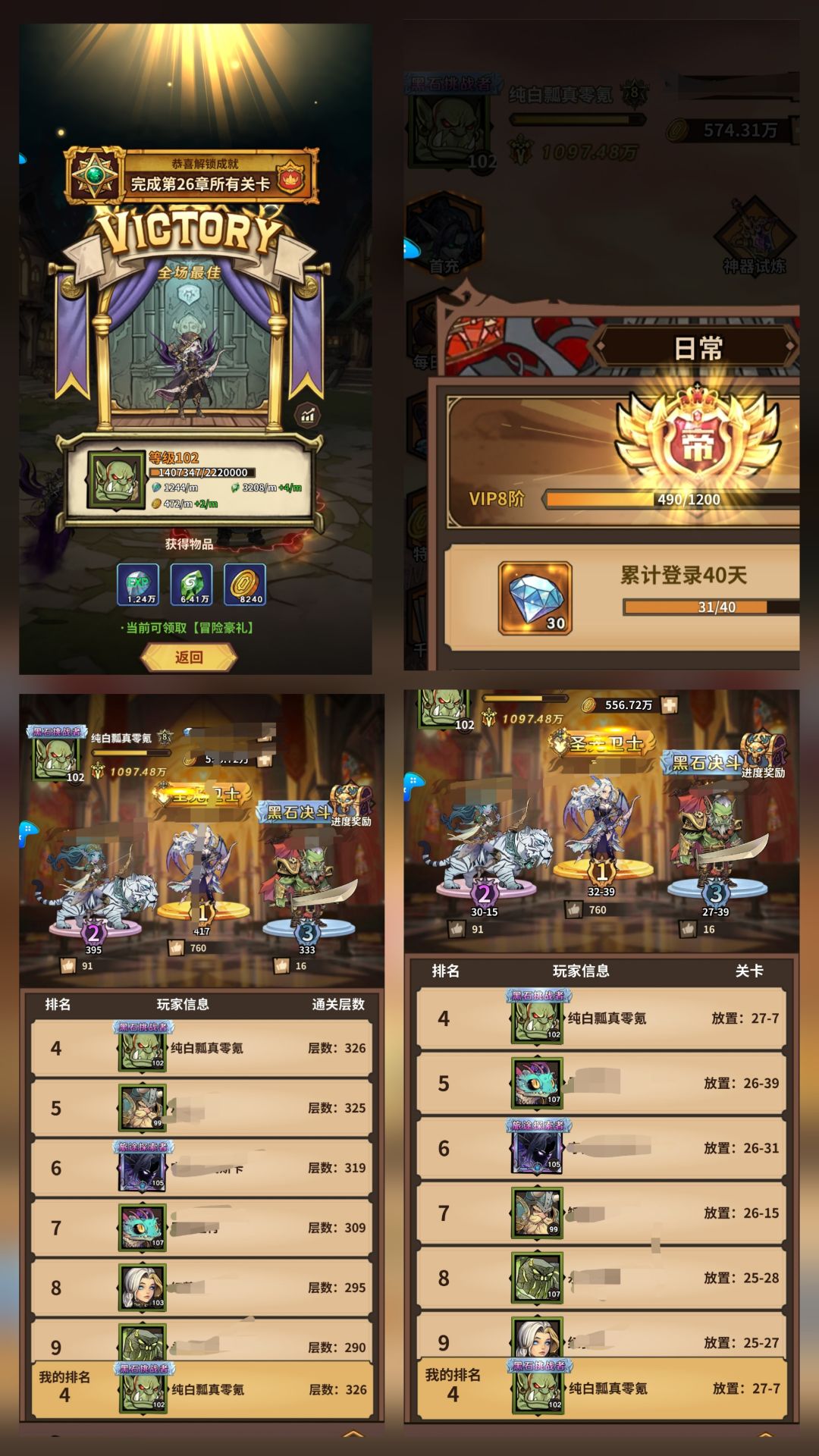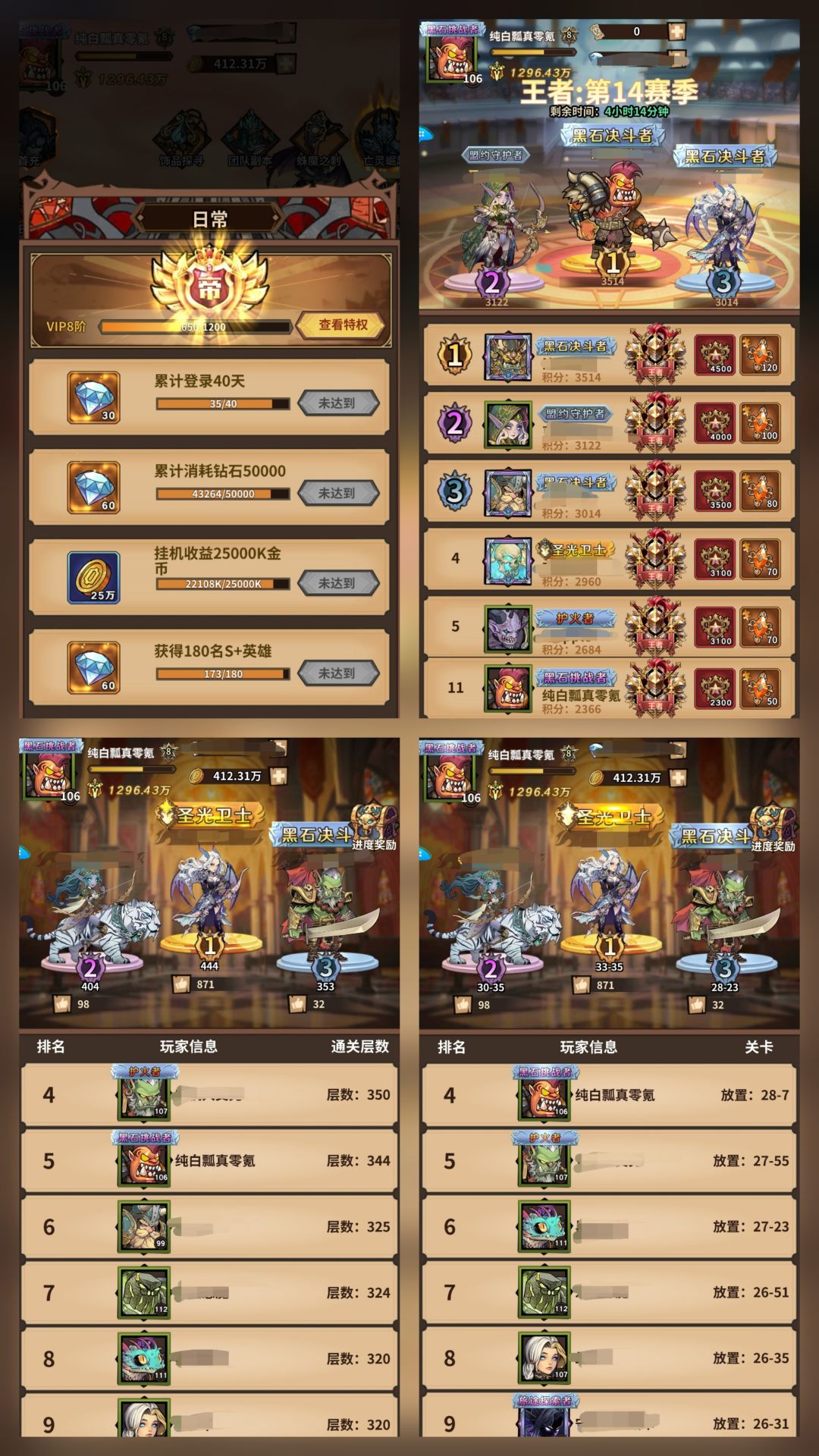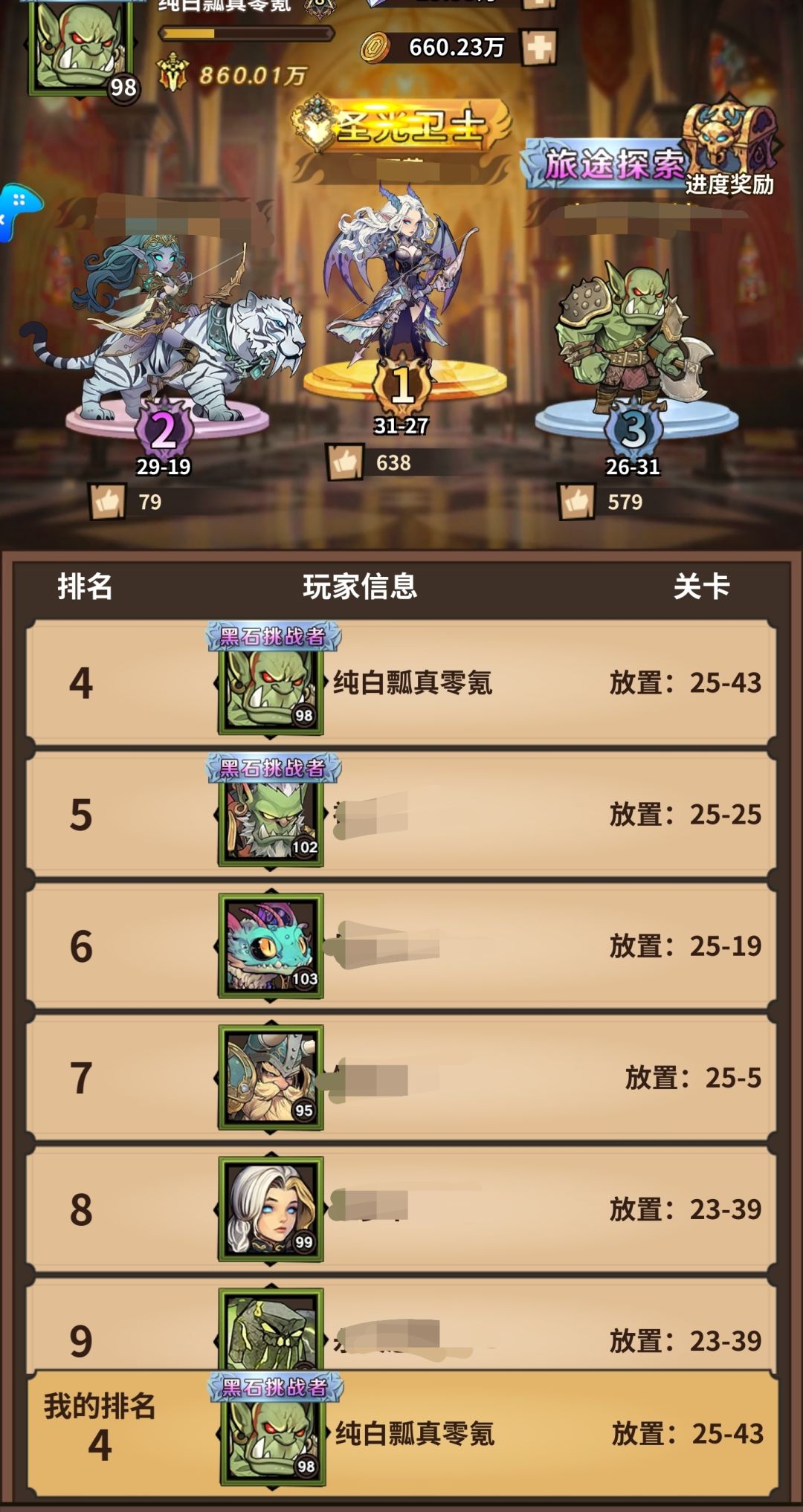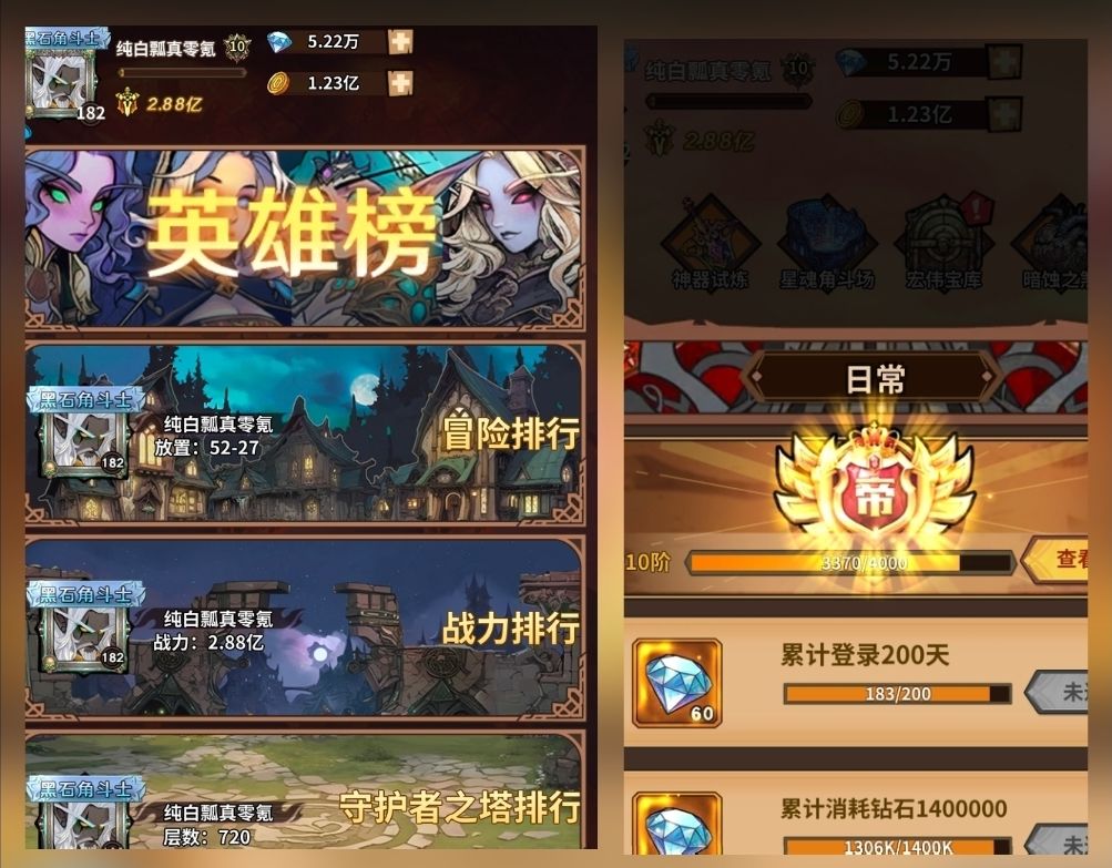 10.9.1 白嫖,打的肯定没氪金的顺利,毕竟马上第三队也要出传奇怪了,但是副本爬塔均是排第三,竞技场前十(没办法,什么都舍不得分解,虚的很)
