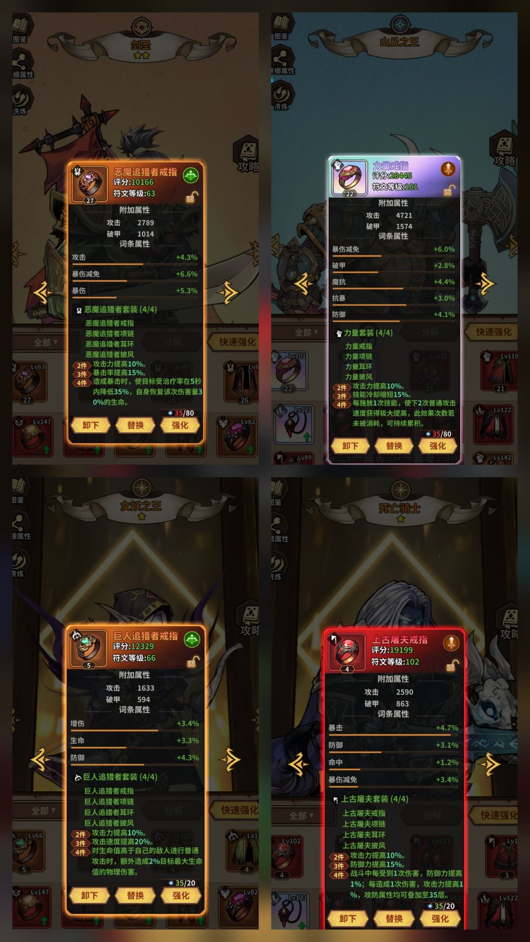① 剑圣用恶魔追猎套,暴击+降疗,打白牛或圣光关卡必备;