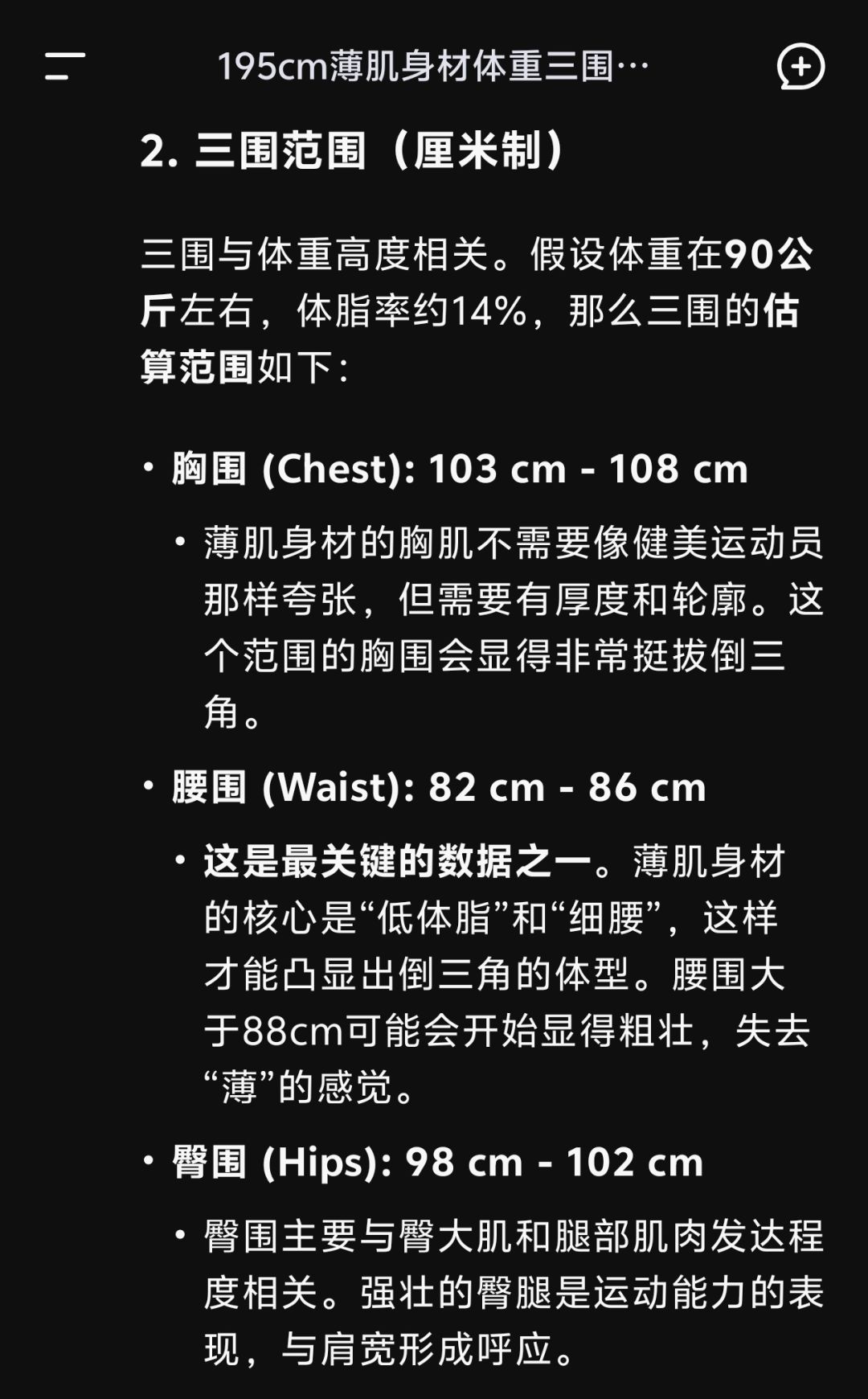 我本来想设一个身高到上限的人族男性角色,其实昨晚找了两个AI软件,问195的薄肌身材的推荐体重和三围,但是显示效果很奇怪,一直都是大肚男,肚子尺寸不对。