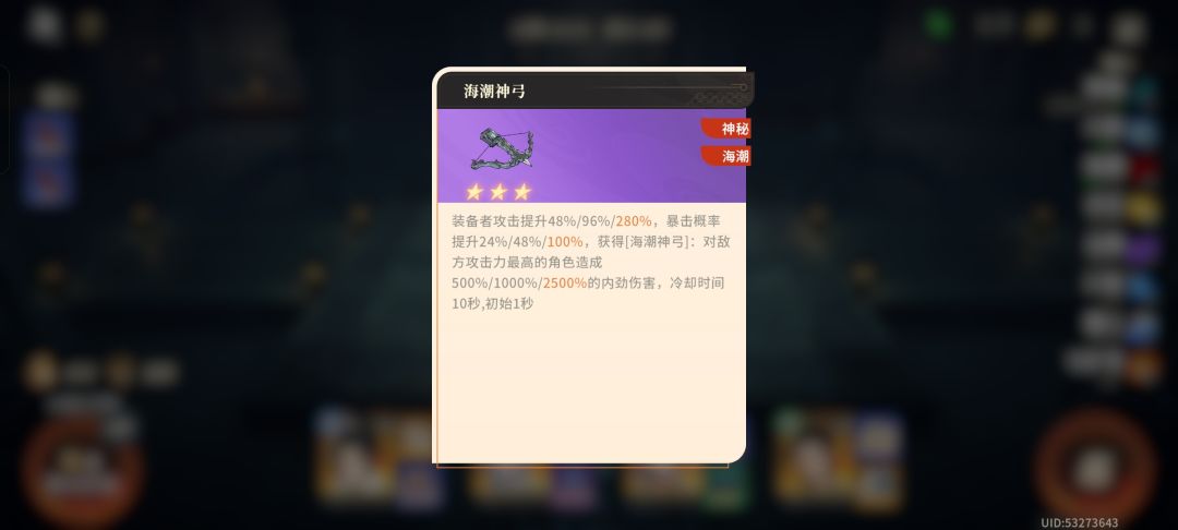 第二输出位:海神弓给第二输出位,开局可以直接秒了敌方后排弓箭手,省的自己去拉。搭配白狼画卷的吸血,保障第二输出位站得住。