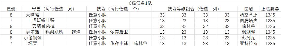 除去两行表头外,剩下六行代表需要六只野兽,其中第一部分星级内容为1、3、4、5行的野兽需要8星,2、6行的野兽需要7星,第二部分野兽内容为1、2、3、5、6行的大嘴蝠、虎斑锐耳猴、变装曼朵拉、小偷钢盔、坏栗是固定的五只,4行的野兽可以从瑟尔潘、鸭梨趴趴和鳄蛙三只中任选一只,第三部分技能内容为1、2、3、5行野兽的两个技能必须都是小队,不过具体是什么小队不限,(经验丰富无条件增加成功率自然任何时候都能使用),4行两个技能可以在小队和依存后卫中任选,可以两个小队也可以两个后卫,一样一个也行,6行同理,就是可选择的技能多了啼林谷,第四部分技能等级组合内容为有四列技能等级组合可以选择,第一列是1、3行野兽两个技能需要全部是3级,2、4、5、6行可以一个3级一个1级,第二列是1行野兽需要两个3级,2、3、4行野兽需要一个3级一个2级,5、6行野兽需要一个3级一个1级,后两列同理,有23还有32是因为23的野兽用的是自带小队3的,第二技能为小队3,继承的是第一技能,按第一技能第二技能的顺序就是23,32是不自带小队3的野兽,用的是第二技能为小队2的,将第一技能继承为小队3按顺序就是32。最后一部分各区域的上场野兽内容为晴空草原需要上场的是1、3、4、5行的四只野兽,图腾塔夫是1、2、3、5行的四只野兽,后四个区域同理(每天的任务会随机从六个区域中选取一个区域作为任务地点)。