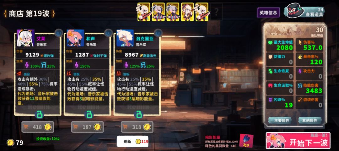 3、中期9-14关,这个时候应该有被动100%额外加成左右,叠的差不多了,现在拉属性收益最大化,一点属性给2.4的效果。音乐家1-3个保命用,紫色金色,每局结束死光就行。道具选择,技能伤害500,伤害加成200,防御30,闪避40,吸血8,生命值800。这是参考范围。