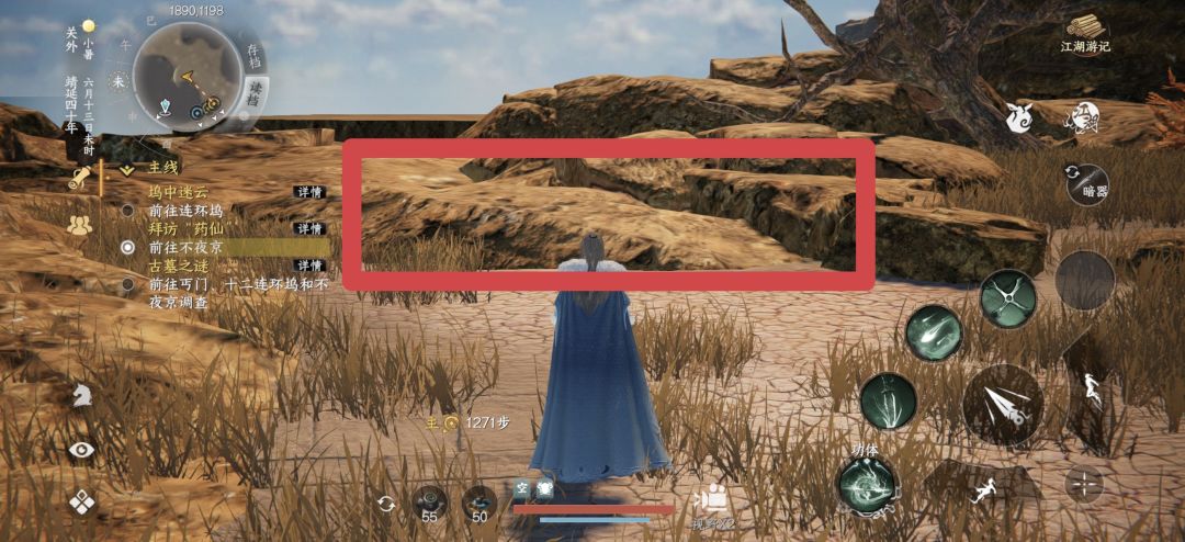 第一步,在1573,1041处行脚商人购买避瘴丹,然后到1890,1200左右有几块大石头,走上去会掉到山洞里。
