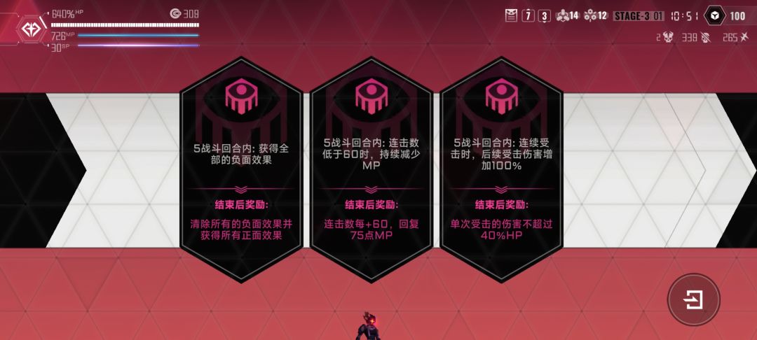 解释一下为什么二村刷到考验直接退,考验房我们要拿的是回合内全部debuff结束全部正面buff,百混开局给你3个,选上之后会+13个,总共16个debuff,完成之后16个debuff会变成96点mp相当于一个五倍的20mp上限。如果二村拿到考验之后,后面三村四村不论契约黑市哪个先出都对我们刷高分不利。所以最优的顺序是二村契约—三村黑市—四村考验。