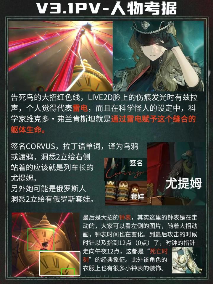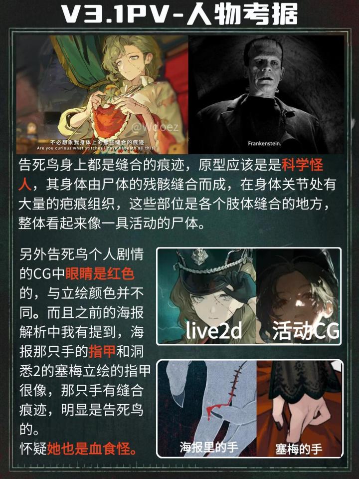 PV出来后大家似乎都认为血食怪就是野树莓,告死鸟是科学怪人,但是因为在上一期的海报解析里我就猜测那只苍白的手指甲和塞梅的很像,手有缝合痕迹那多半是告死鸟的手,加上告死鸟个人剧情的CG中眼睛是红色的,与立绘颜色并不同,而PV最后告死鸟也是红瞳,所以我大胆猜测告死鸟也是血食怪,谁说一个角色只能有一个身份了,总之神秘学的事情都有可能!![[心动小镇_可以]](https://img-tc.tapimg.com/market/images/4c79219b65542ac797abb46bfdc7f252.png)