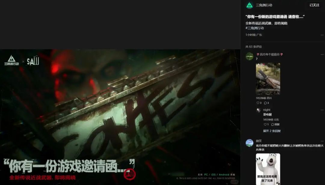 就在刚刚,《三角洲行动》官宣和《电锯惊魂》展开联动,并表示“全新传说近战武器,即将揭晓”,大概率是电锯类型的近战武器: