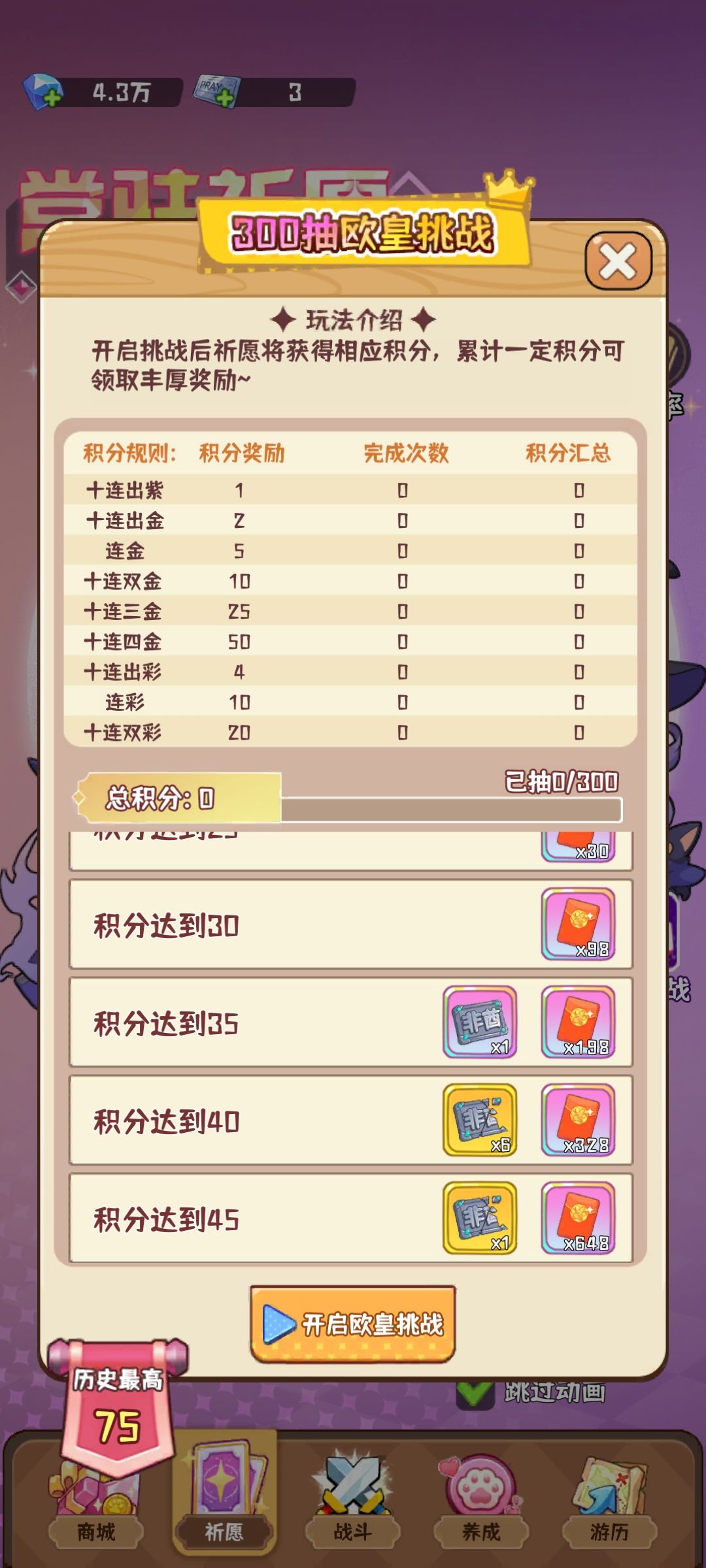 2.欧皇挑战可以重复开,300次抽完领取奖励后会提示是否开启欧皇挑战,所以只要欧皇挑战的分数达到45分,就有1200红包,重复上述1操作就可以重复挑战,直至获得欧皇认证