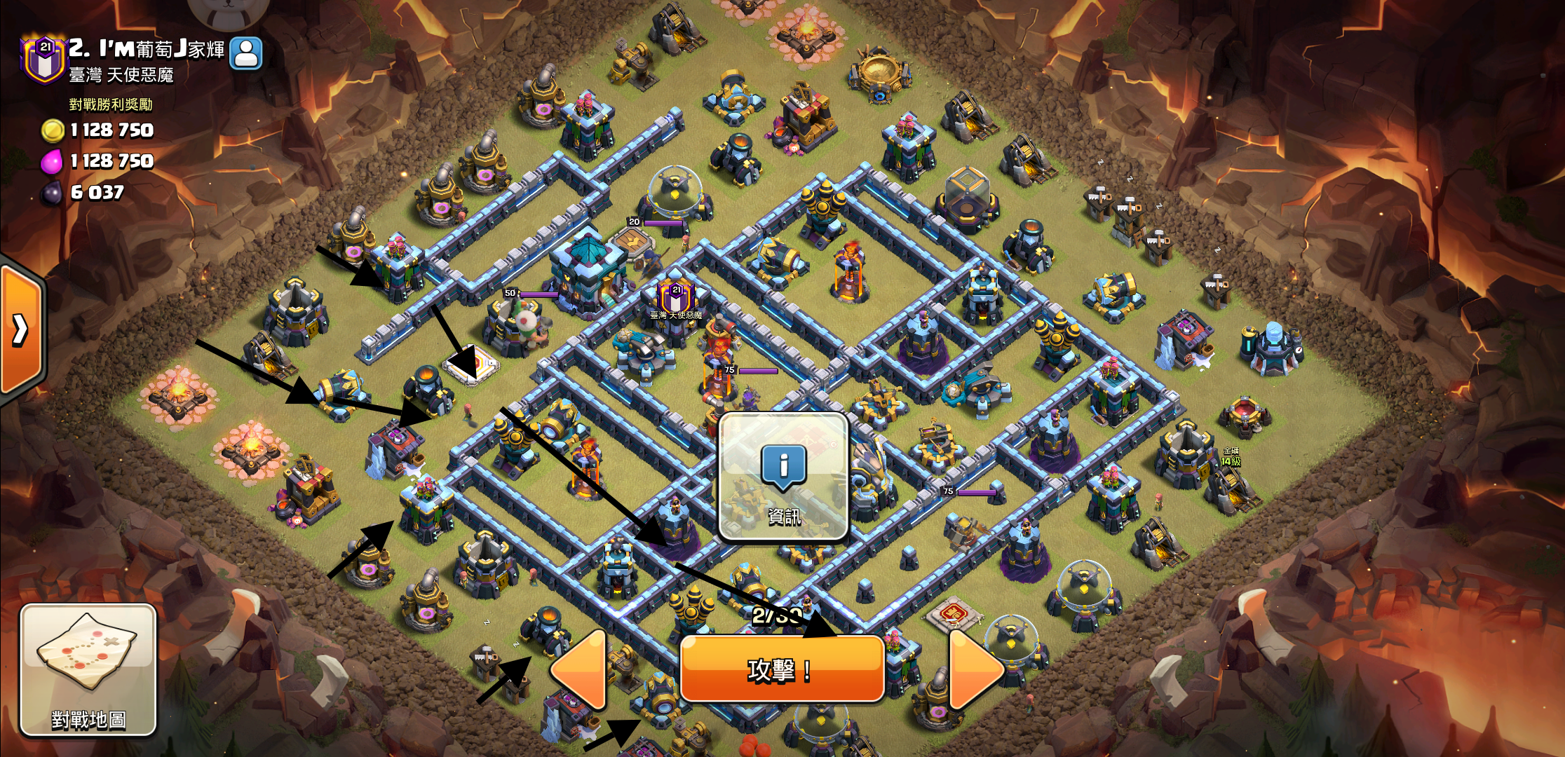 1.确定核心防御。首先,双投石的位置核心建筑特别密集,位于大本附近的投石,有吹风机城堡多头地狱塔,位于鸟炮的附近的投石与女王,一个对空连弩,鸟炮在一起。这两块区域就变成我们前戏的着手点。