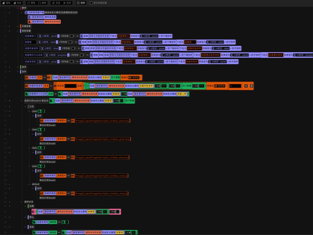 当玩家属性变化时,客户端也会收到我们写好的服务端触发器发来的事件。那么当此事件触发时,就同步更新玩家属性相关的内容——比如刚刚创建的“能量值”。这里我们计算出要显示的能量值和能量恢复速率数值,并将其转化为字符串赋值给要为玩家显示的label控件上。接着,将当前能量值除以能量上限,就得到了要赋值给progress进度条的进度值(P9)