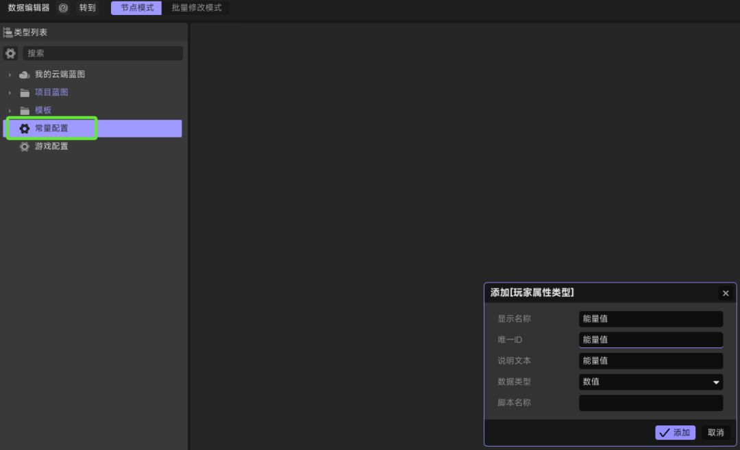 玩家拥有的能量值属于玩家属性。既然当前游戏里还没有这个属性,那就直接打开数据编辑器,在“常量配置”中找到“玩家属性类型”并添加创建。这样“能量值”就成为了游戏内的玩家属性之一(P8)