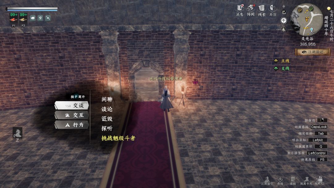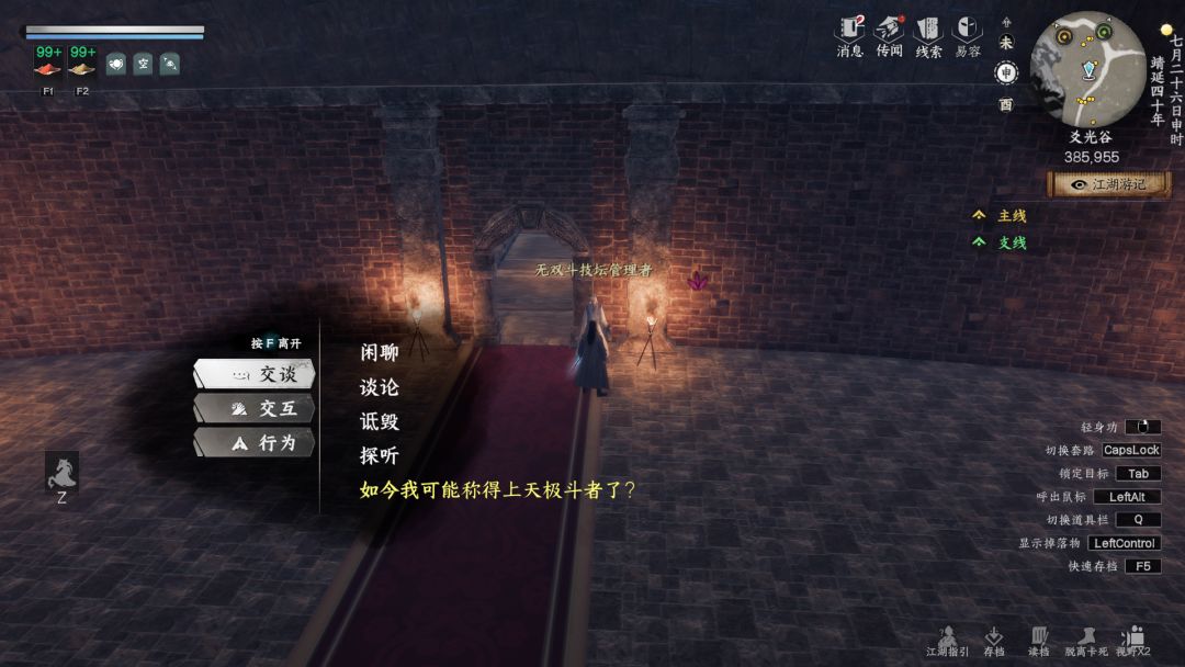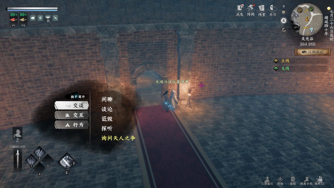 来到斗技场内384.955对话无双斗技坛管理者询问天人之争后继续对话参加天人之争