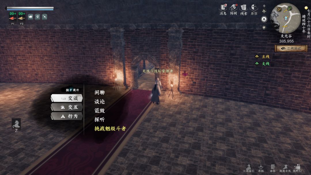 击败敌人后来到385.955对话无双斗技坛管理者挑战魍级斗者