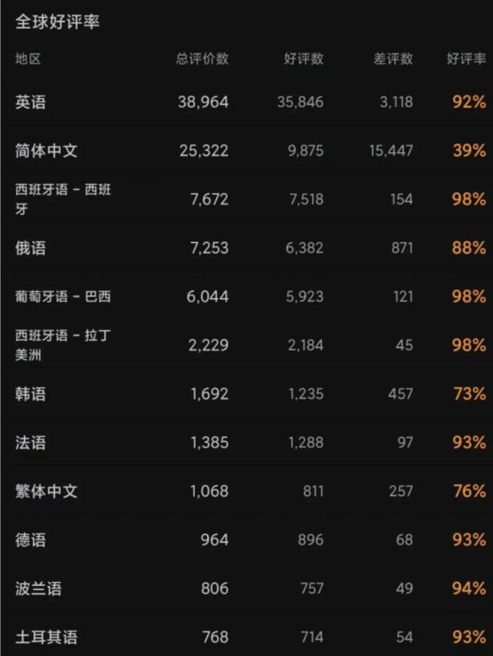 《空洞骑士:丝之歌》在全球Steam平台好评率为78%,但简体中文区好评率仅39%,大幅低于英语区(92%)、西班牙语区(98%)等多国数据。尽管制作组Team Cherry已承诺优化中文翻译,但差评并未止步。除翻译问题外,中文玩家集中批评游戏内经济系统失衡,念珠获取少而物价偏高,导致成长反馈薄弱。此外,空战比例过高、难度曲线设置不佳等问题,也影响了整体体验,与发售前“适合新人”的宣传形成较大反差。