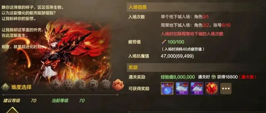 主要产出70级史诗、超凡装备、深渊票、矛盾炉岩炭礼盒、以及魔刹石!