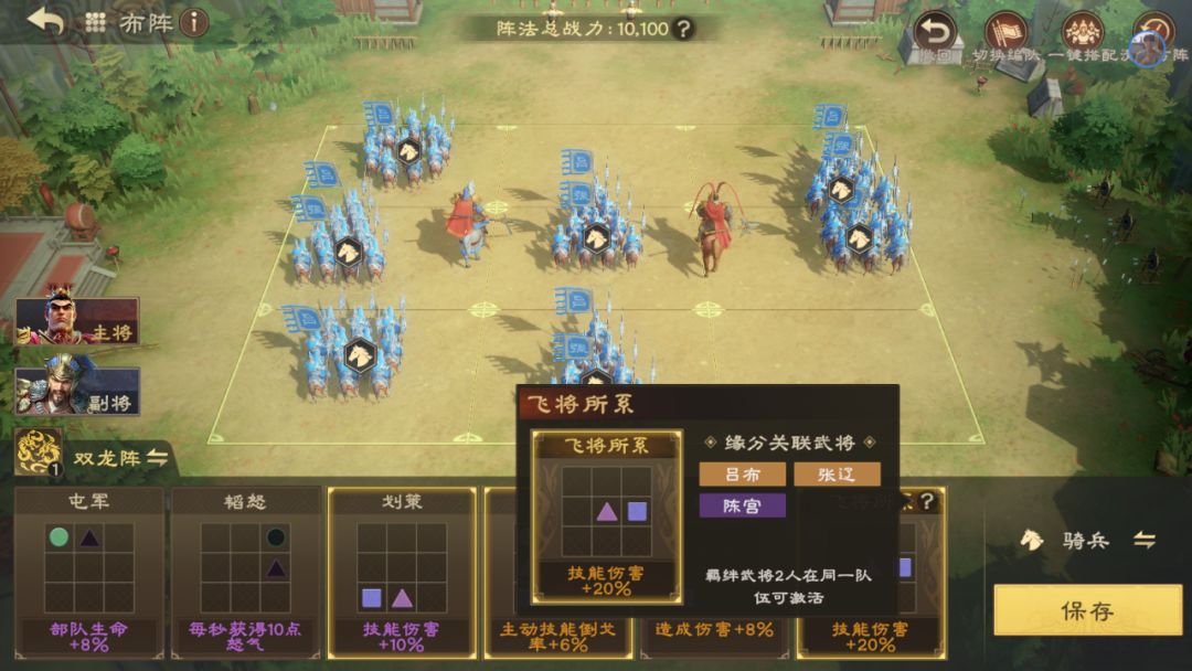 除此之外,特殊的武将之间还会有强大的羁绊加成,可在布阵界面激活。