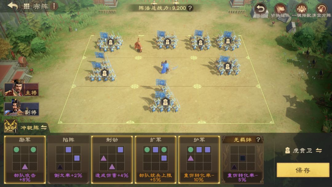 根据选择的主副将,搭配合理的阵型,以反击队为例,主公可以选择契合反击流派的冲轭阵。