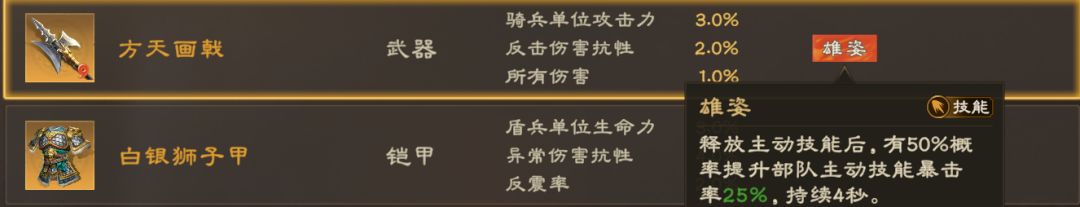 例如这里,方天画戟提升骑兵单位攻击力以及所有伤害,专属特技也是和技能挂钩,因此该装备可以选择给吕布等骑兵技能伤害武将带。主公尽量选择与武将特性相挂钩的词条着重培养。
