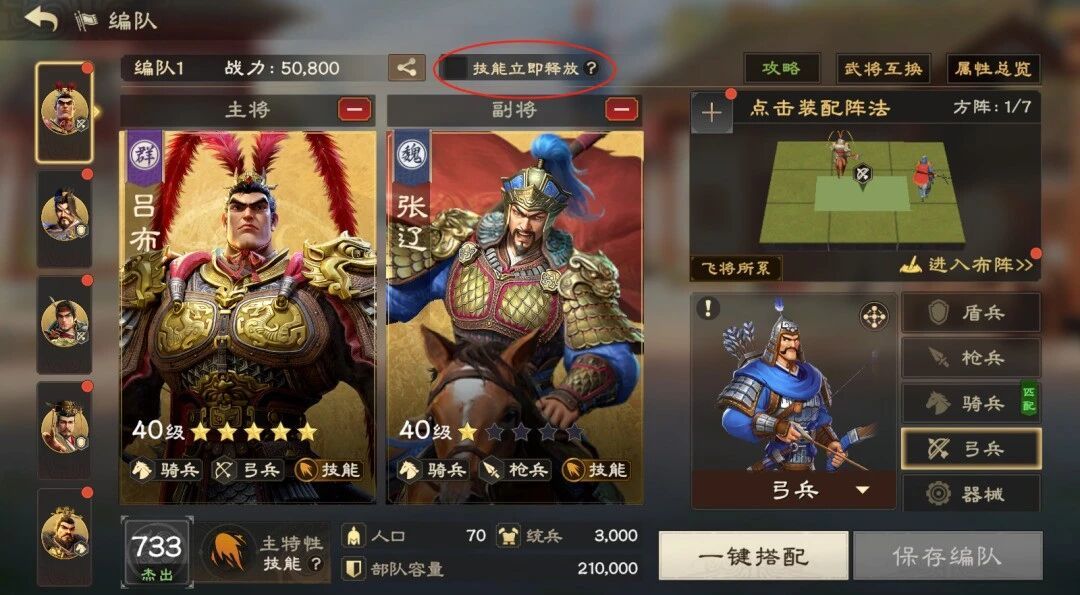 打开编队界面,点击上方开关即可将技能设置为自动释放。主公在开荒期也可以选择,后期接战尽量手操为主。