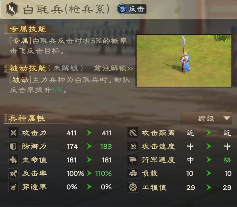 而白毦兵也适合反击流,但移速快,输出高,更适合追击和野战使用。主公可以根据实际情况择优选择。