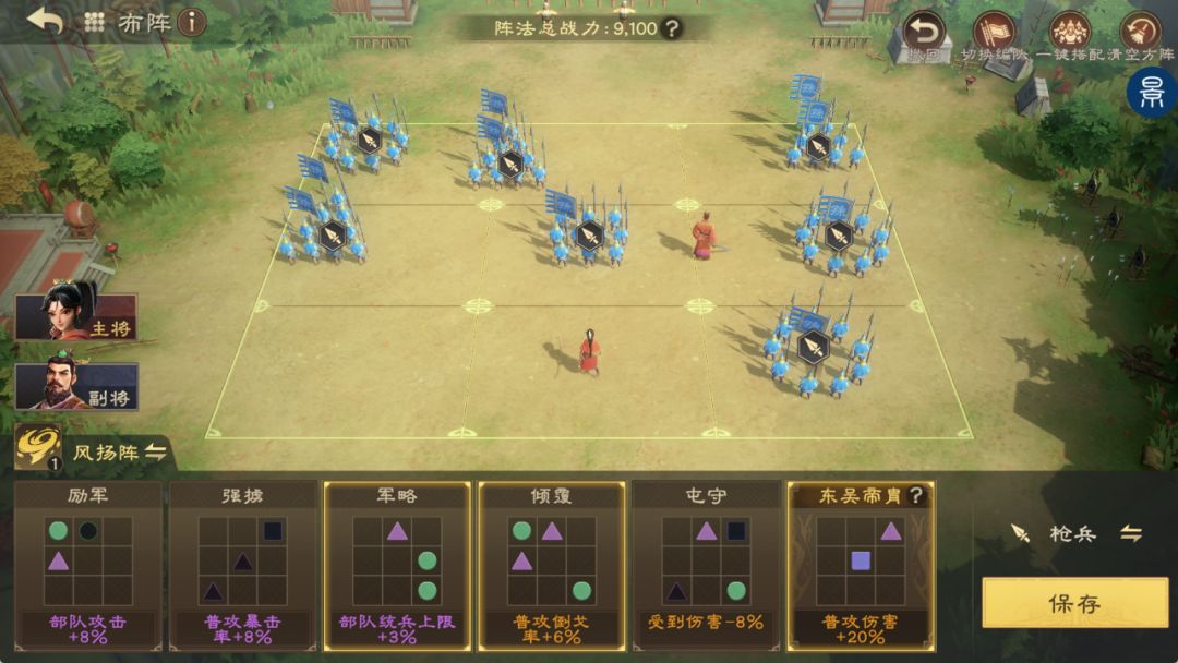 所以在阵型的布置中,主公需要避免主副将过于靠后,发生主副将尚未承伤,部队已经死伤殆尽,从而导致失败的局面。
