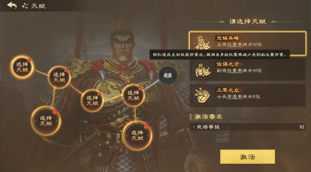 武将天赋的选择,主公必须根据队伍类型来进行抉择。例如,这里吕布是靠技能输出打伤害的武将,因此抗震率便非常适配吕布,就可以选择定韬兵略。