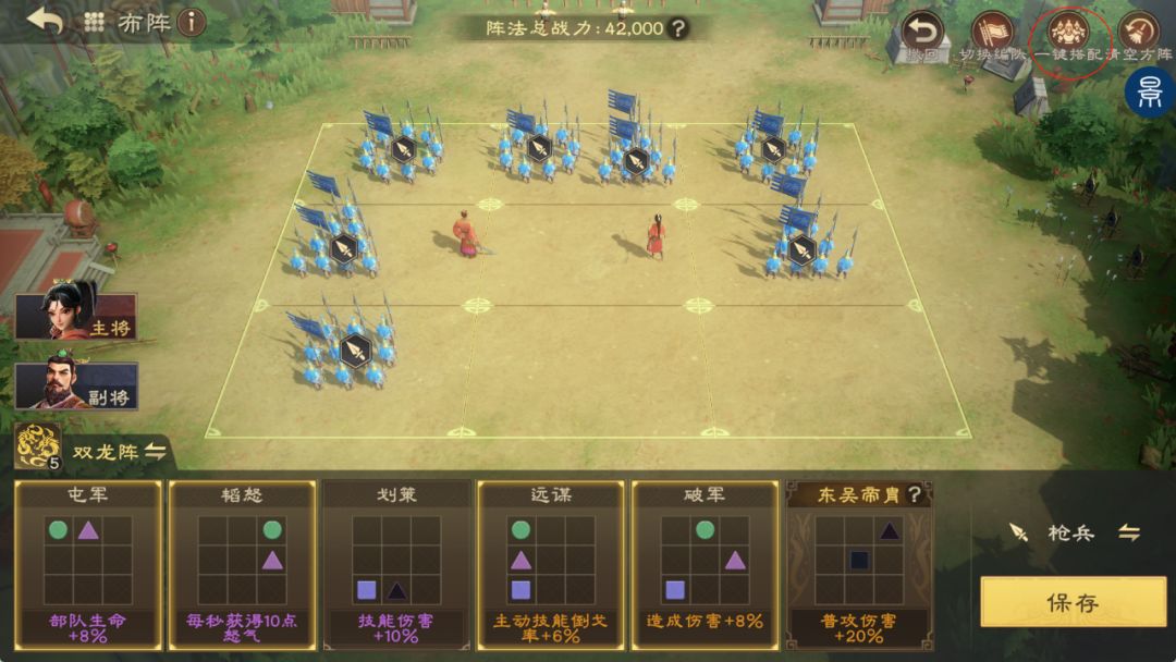 首先,通过右上角一件搭配,可以为主公激活最多条目,但主公要选择适合自己队伍的属性条目。如下图,是孙权、孙尚香的普攻队伍,更需要普攻增伤或倒戈,这时要灵活变动,不可盲目选择条目多的搭配。在保持阵法的前提下,尽量保证武将处于后排安全位置,避免率先暴毙。