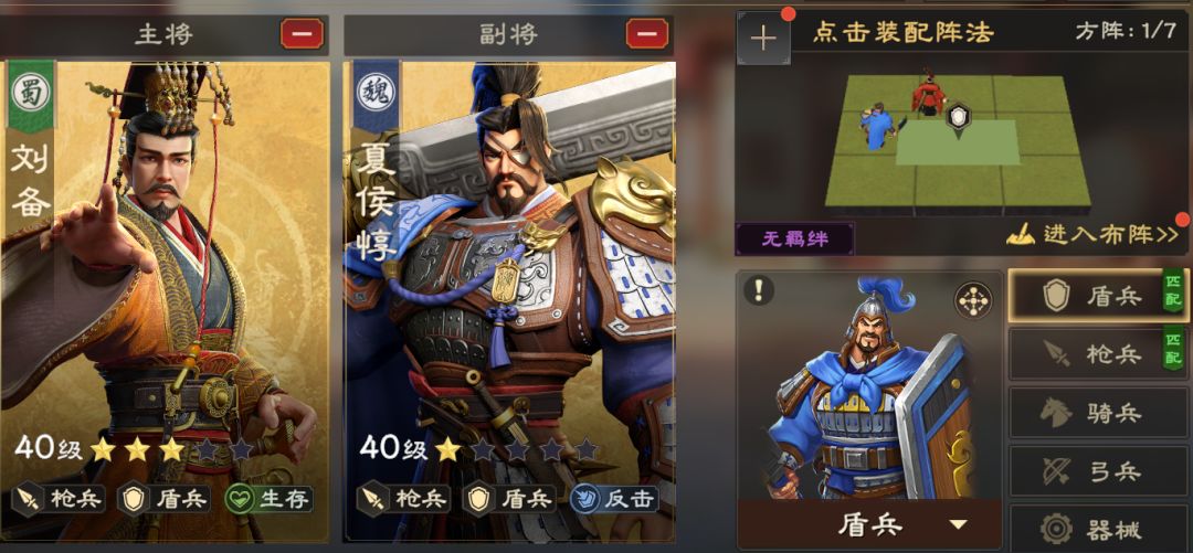 除此之外,像刘备夏侯惇队,刘备本身被动技能拥有高额减伤,因此主公可以在不影响条目加成的前提下。选择把刘备放前排承伤,适当减轻部队的压力。