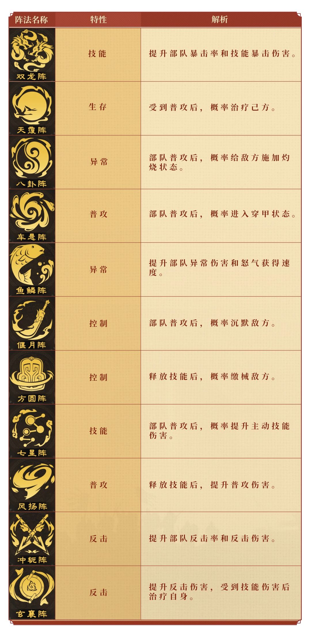 要选择适合流派的阵型,这里阿武为主公整理了所有流派的阵型以及解析,主公可以自行查看。紫色阵法除前期开荒外,基本没有过多用处,这里就不做赘述。