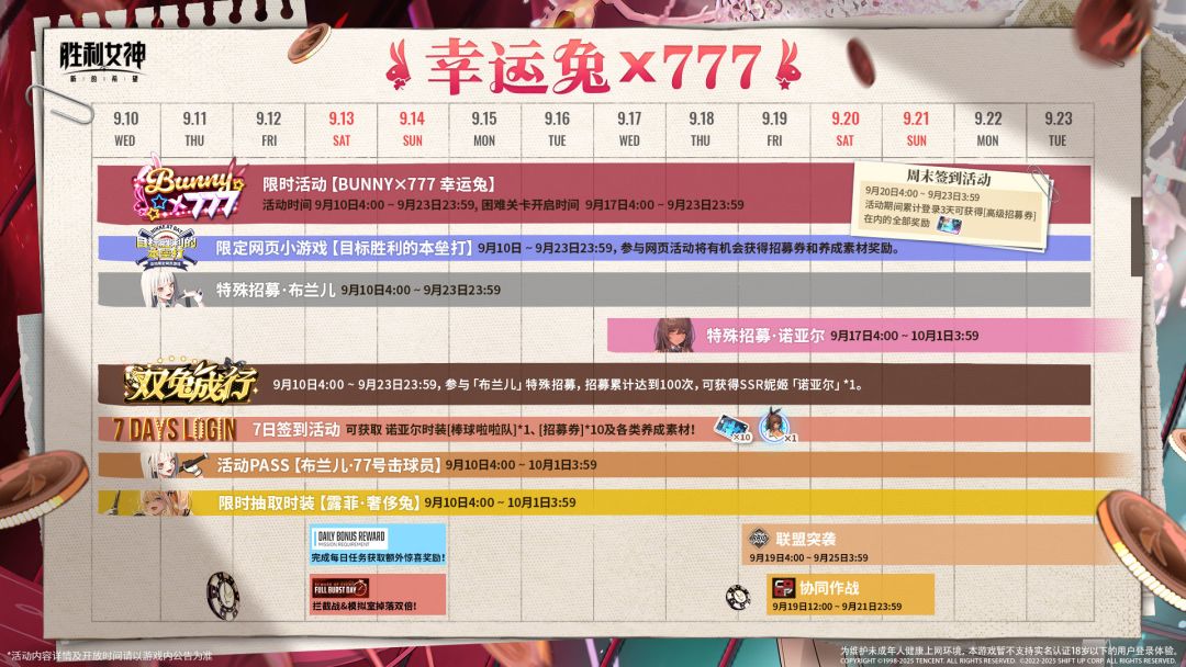 《胜利女神:新的希望》全新版本「幸运兔 X 777」将于9月10日上线!版本更新内容与活动详情已全面收录,请指挥官查收本次版本活动日历!