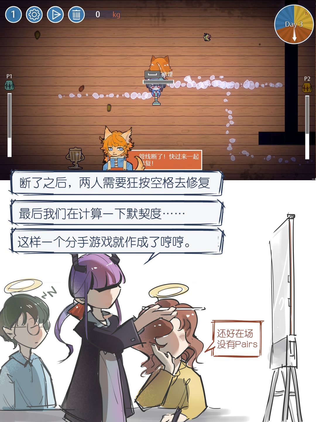 限制+清洁+合作,便得出了我们⽤吸尘器清理房屋、但两⼈共⽤⼀根清洁管道的设想。玩家需要在有限的时间内清洁房屋,获得更⾼的积分;同时不能受环境诱惑分开得太远,导致管道被拉断。拉断后需要两个玩家贴在⼀起共同连点攻击键,把管道尽快修好、继续得分。