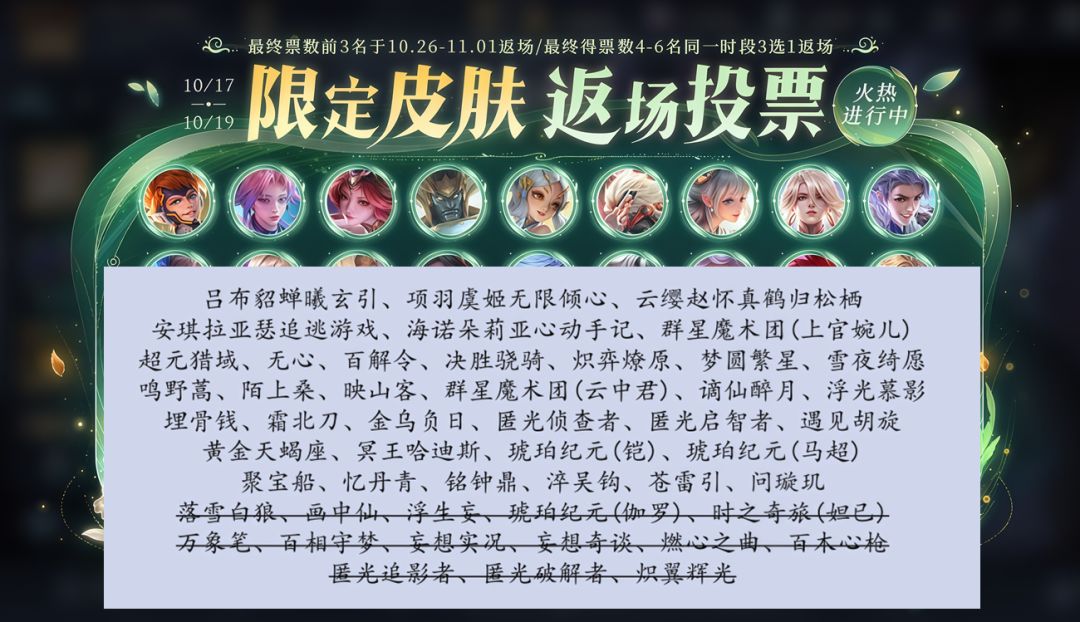 对于能参与投票的皮肤,大家的兴趣很高,虽然官方还没有公布具体的皮肤名单,但想参加的基本条件是还能直售返场,上图中的皮肤就是还能直售返场,画横线的皮肤是已经通过礼册返场,但仍有直售返场次数。
