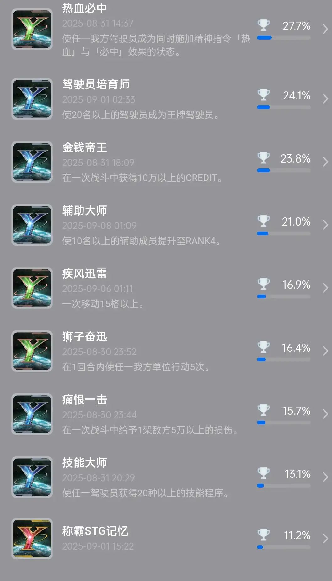 精神统一- 会少的应该是稀有精神:威吓、希望、扰乱。这几个精神比较少人有,个人这里只列出主驾驶:[这里理论来讲带上这几个加上原本的是够的,这里一定要打开检索之后到这里才会跳出成就。]