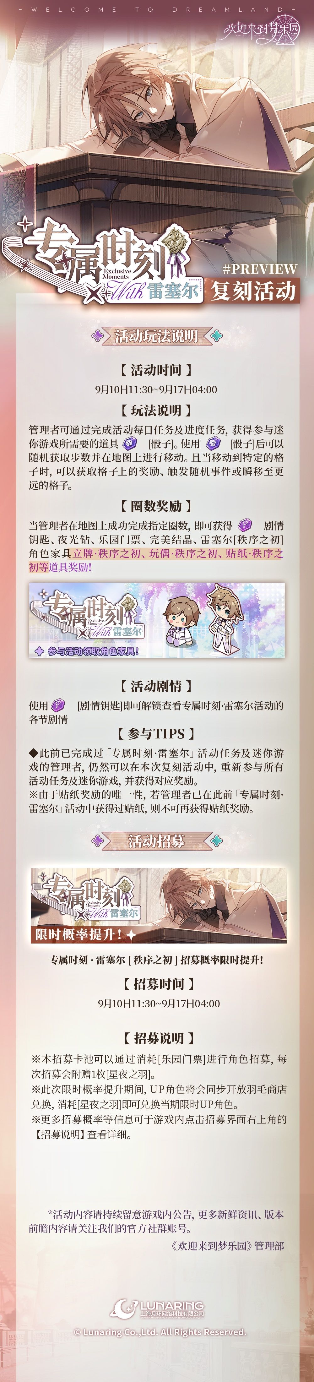 ✨全新复刻活动「专属时刻·雷塞尔」9月10日开启!