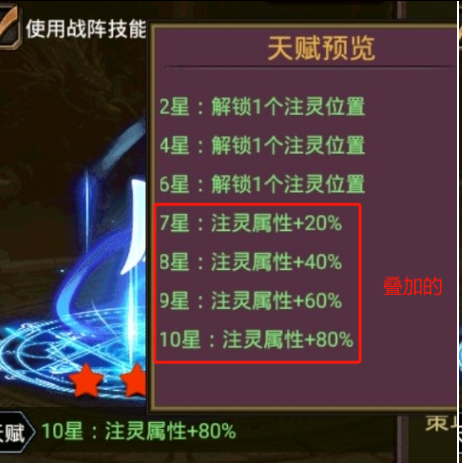 A10:可以叠加,满星后就是注灵属性+200%。