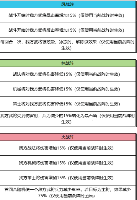 灵石:灵石分为攻击灵石、防御灵石和技能灵石,等级最高为5级,可以通过战阵炼造来获得,攻击灵石和防御灵石在不同战阵中属性都是一样的,有单一攻击属性的攻击灵石,也有战普策三属性的灵石,最高都是增加30%,技能灵石的技能效果在文章后面有详细列出。