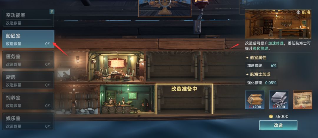 还有必不可少的舱室改造,船只改造船匠室及医务室可以大大加强我们手术修理速度及效果!