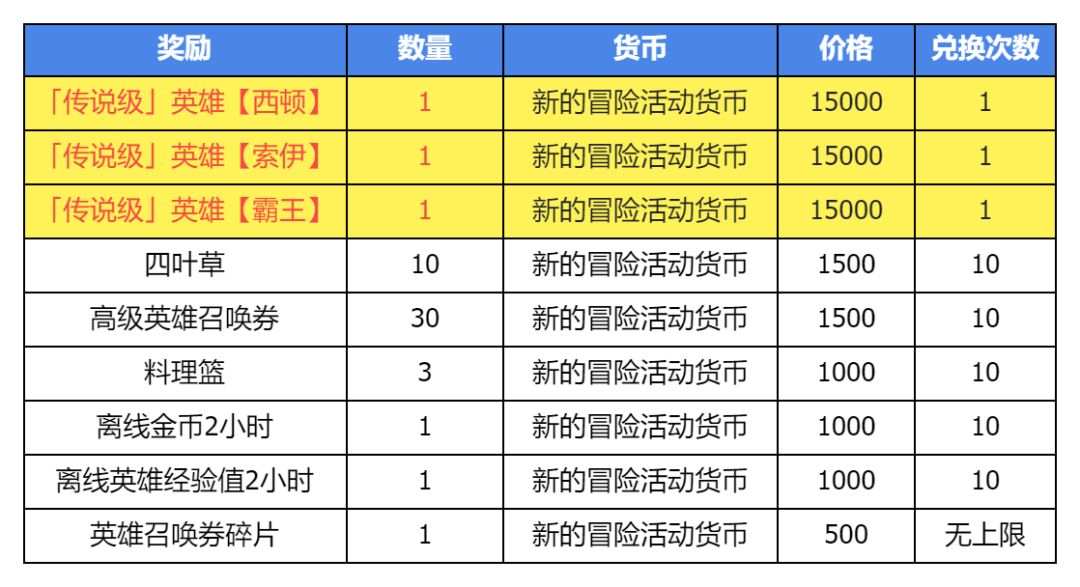 完成每日任务获得【新冒险活动货币】,活动期间可兑换「传说级」英雄【西顿】、【索伊】、【霸王】,以及【高级英雄召唤券】、【四叶草】等稀有奖励。