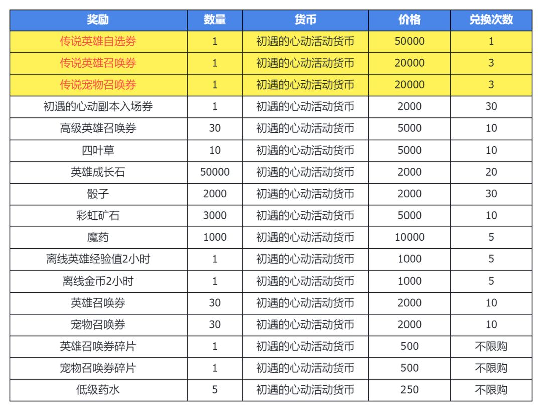活动期间,可以消耗活动副本入场券挑战活动专属副本,完成副本可以获得「初遇的心动活动货币」,可以在活动商店兑换【传说英雄自选券】、【传说英雄召唤券】、【传说宠物召唤券】、【高级英雄召唤券】等稀有奖励。