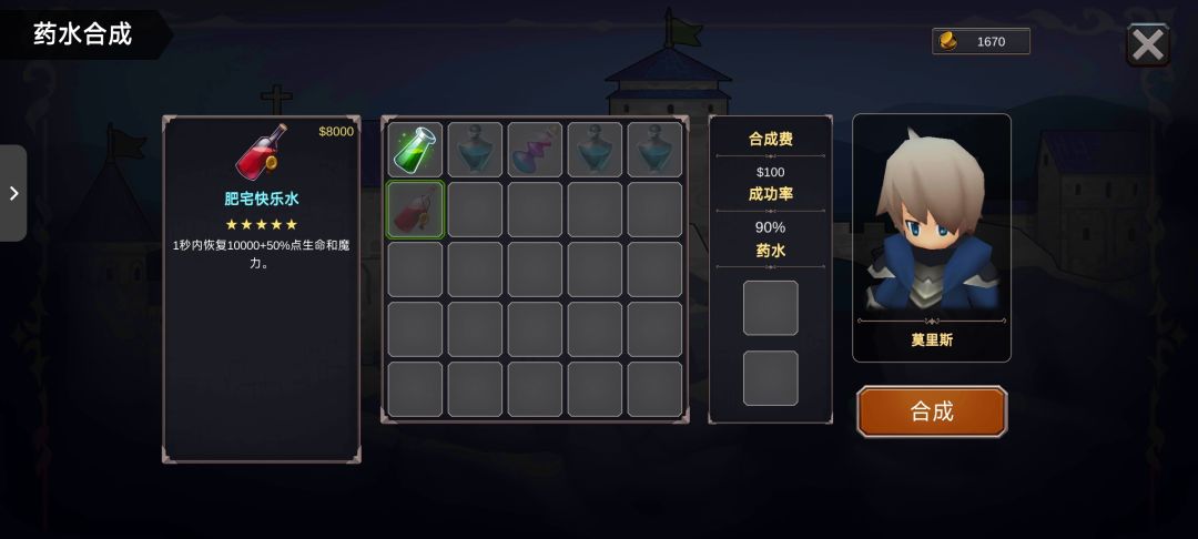 过完任务不用管爆出来啥,最次就是两千块的顶级强化石。回法提城找药水商人买两组高级和极品蓝药,共十瓶。我有一个档靠这十瓶蓝药合出来两瓶肥宅水和一瓶神仙水,那个存档真是完美开局,可惜地下迷宫玉玲珑96%概率的羽毛居然没爆出来,破防了。