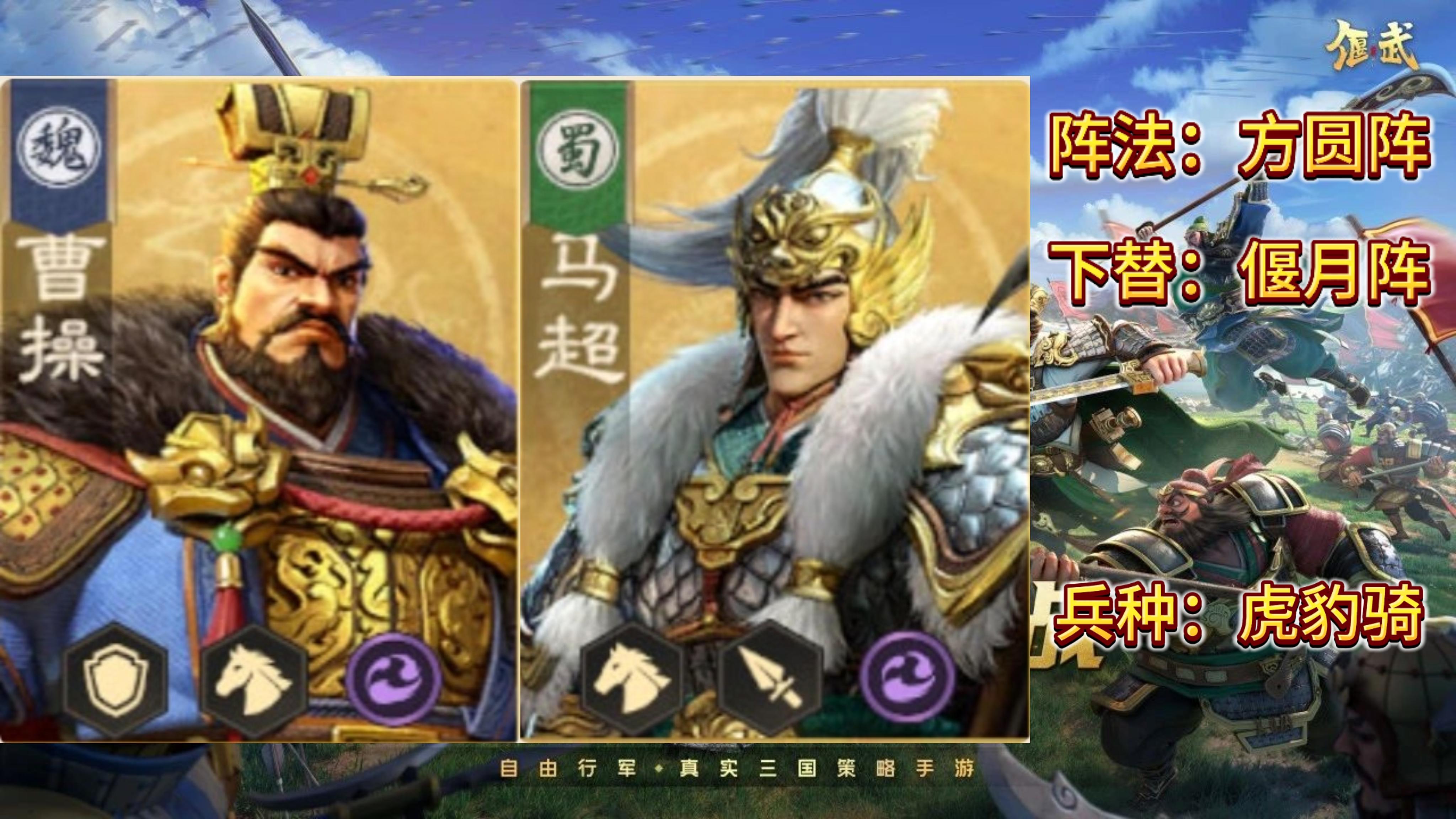 由曹操加马超,搭配方圆阵和虎豹骑组成,主要特点通过对敌军频繁施加缴械、沉默和禁疗效果,降低敌军输出,在战斗中偏辅助,然后由于该队普攻伤害较低,而且还是骑兵,所以容易被反击枪克制。