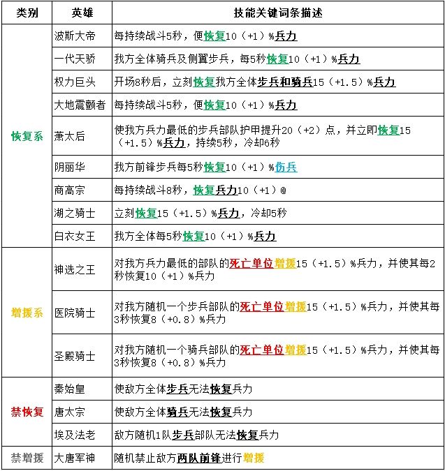 增援是针对死亡单位的,恢复是针对兵力和伤兵的。在上表中的英雄技能,恢复和禁恢复相对应,增援和禁增援相对应,但禁恢复技能对增援技能无效,而禁增援技能同样对恢复技能无效!